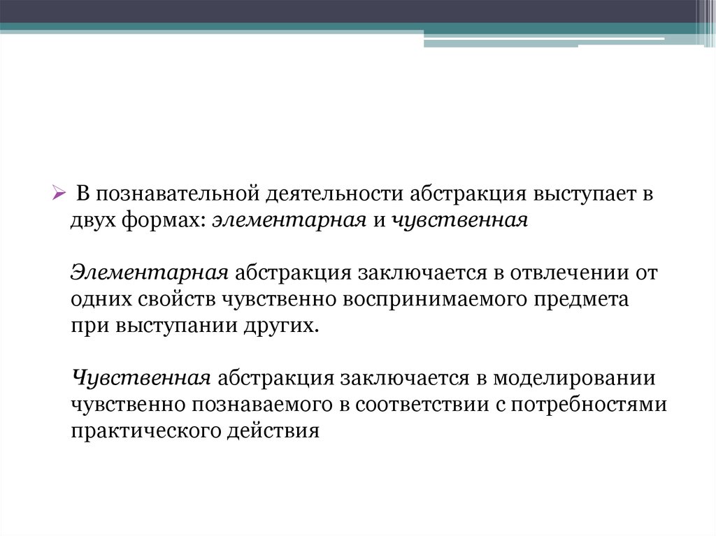 В познавательной деятельности абстракция выступает вдвух формах: элементарная и чувственная