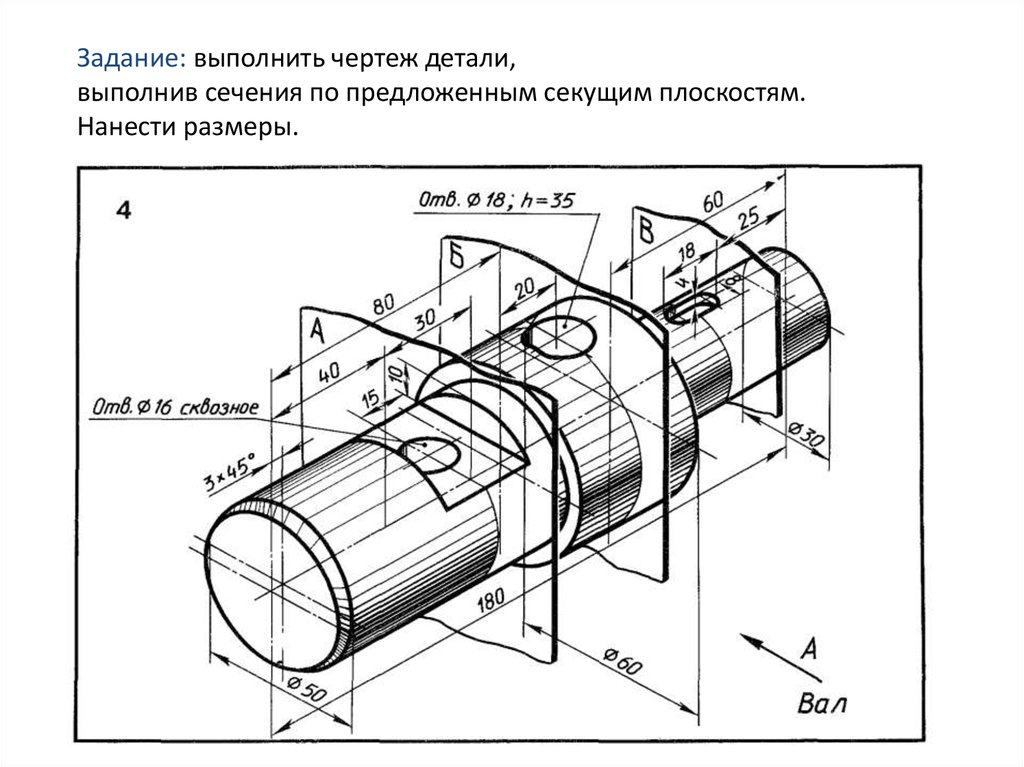 Задание: выполнить чертеж детали,выполнив сечения по предложенным секущим плоскостям.