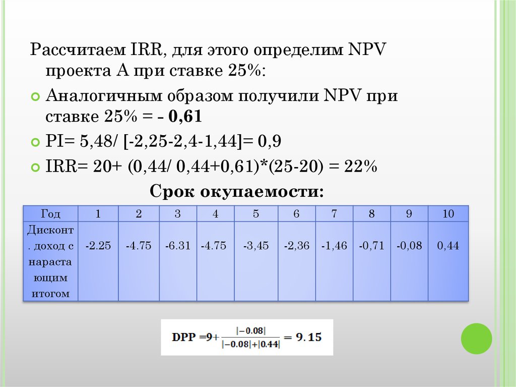 Рассчитаем IRR, для этого определим NPVпроекта А при ставке 25%: