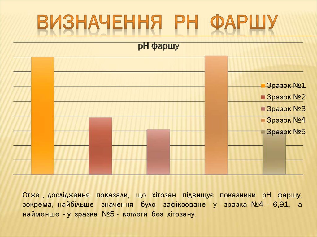 Отже , дослідження показали, що хітозан підвищує показники pH фаршу,