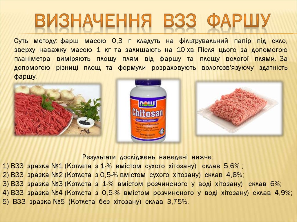 1) ВЗЗ зразка №1 (Котлета з 1-% вмістом сухого хітозану) склав 5,6% ;