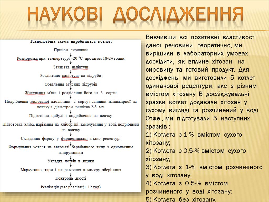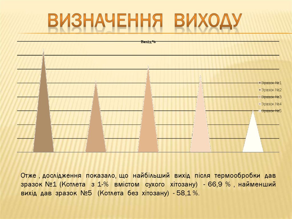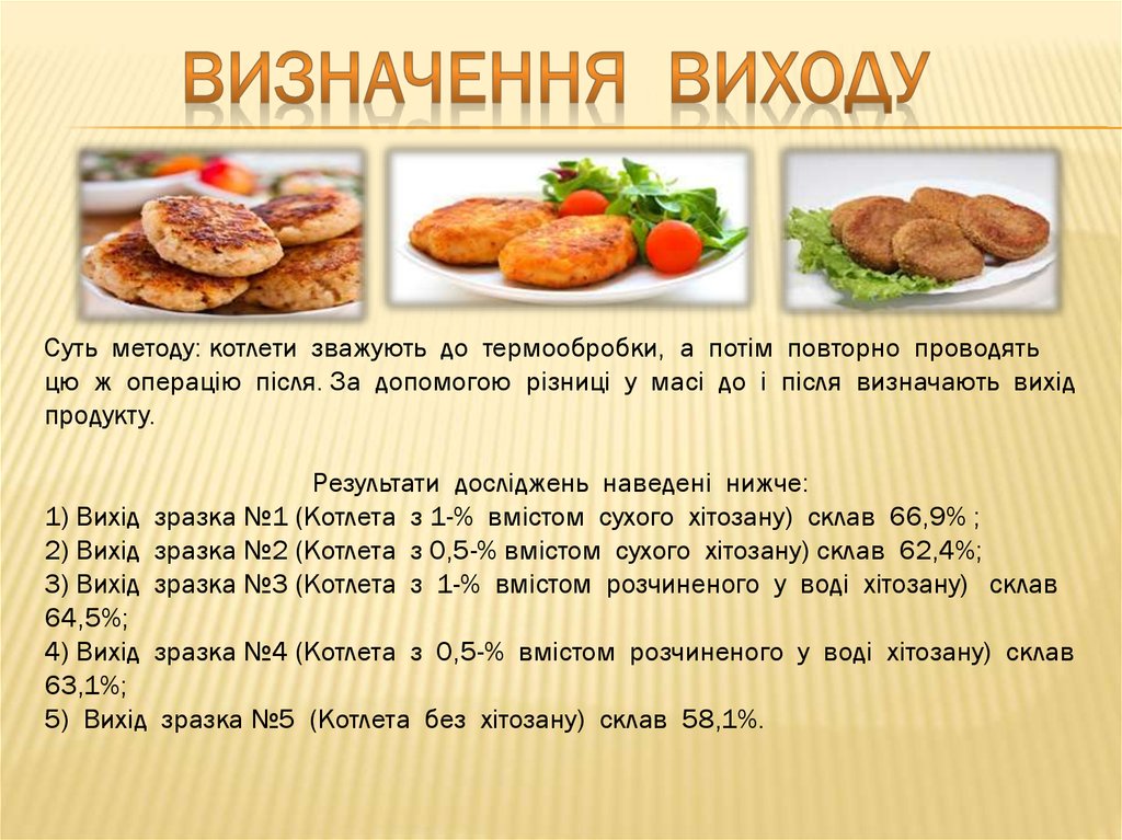 1) Вихід зразка №1 (Котлета з 1-% вмістом сухого хітозану) склав 66,9% ;
