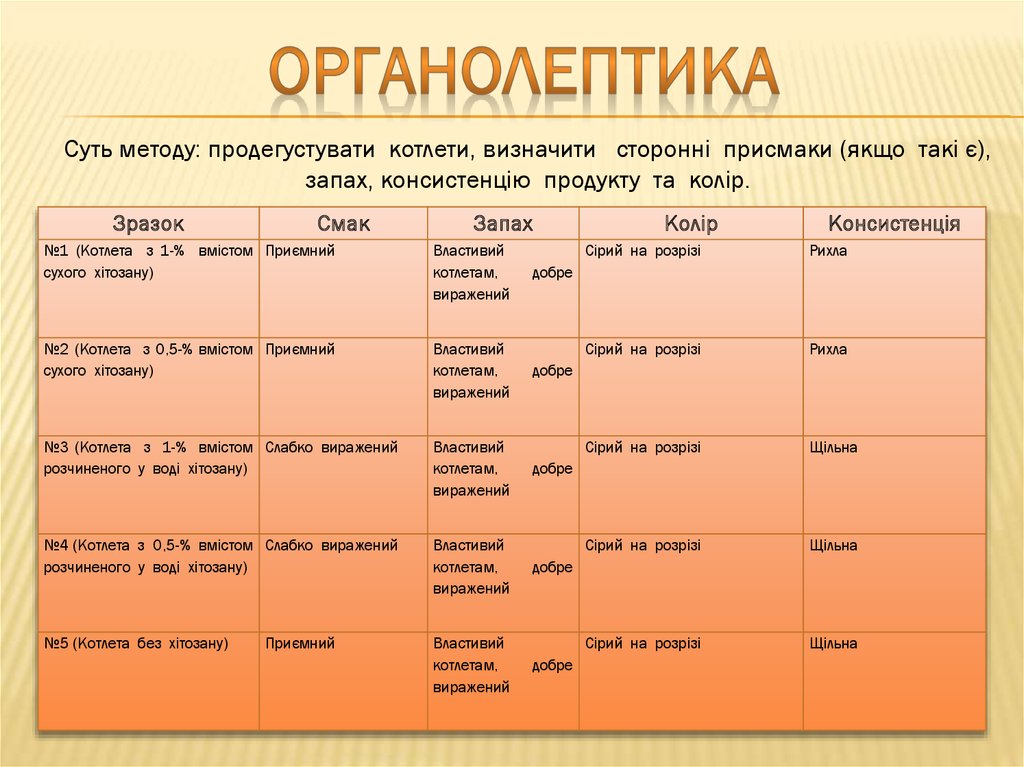 Суть методу: продегустувати котлети, визначити сторонні присмаки (якщо такі є),запах, консистенцію продукту та колір.
