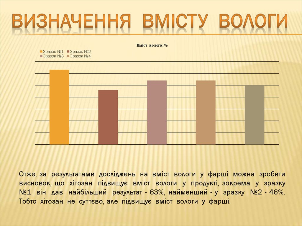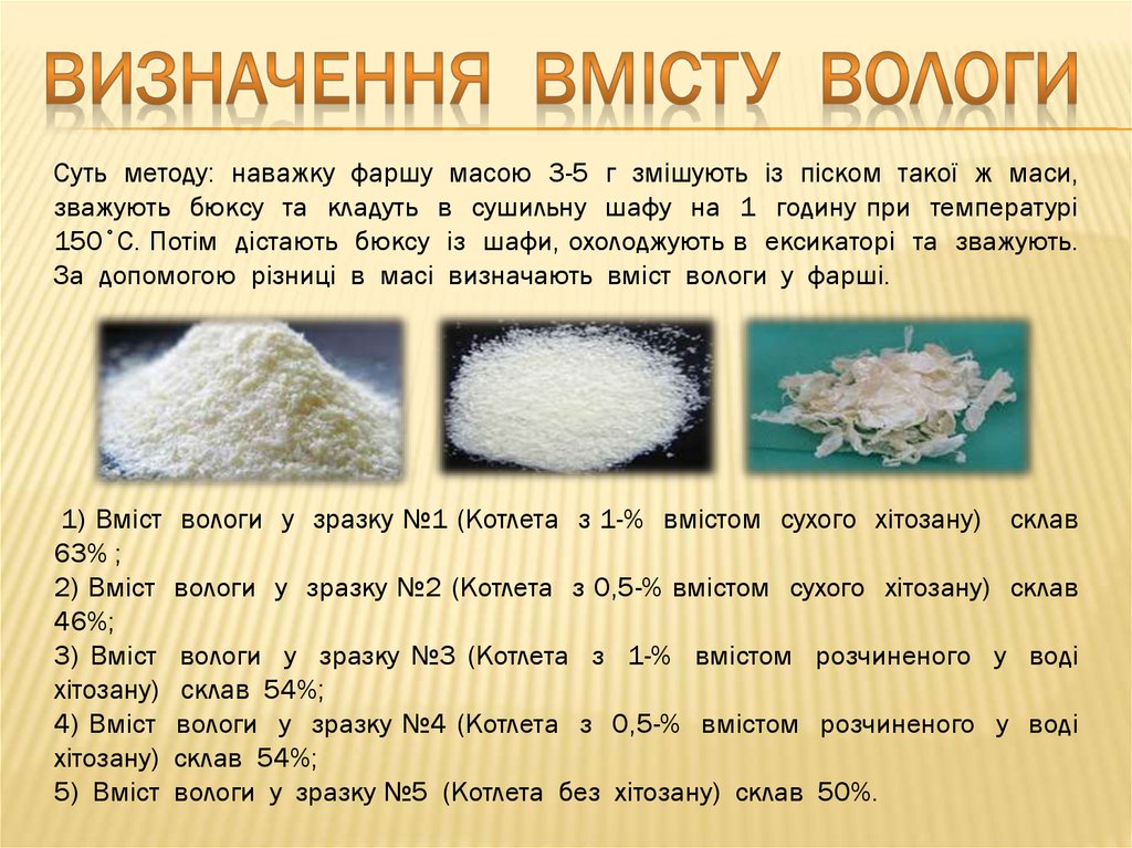 висновок, що хітозан підвищує вміст вологи у продукті, зокрема у зразку