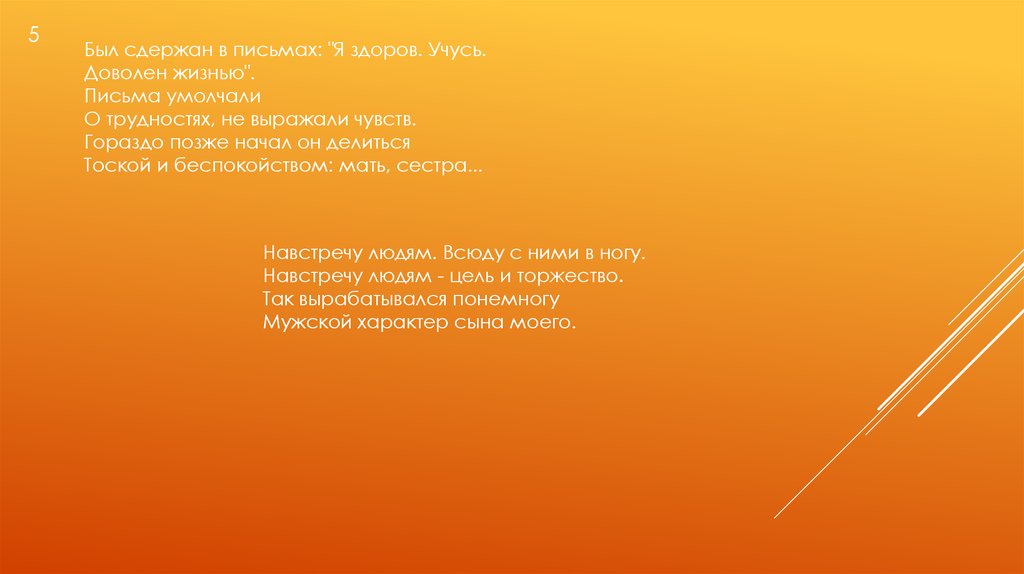 5Был сдержан в письмах: "Я здоров. Учусь.