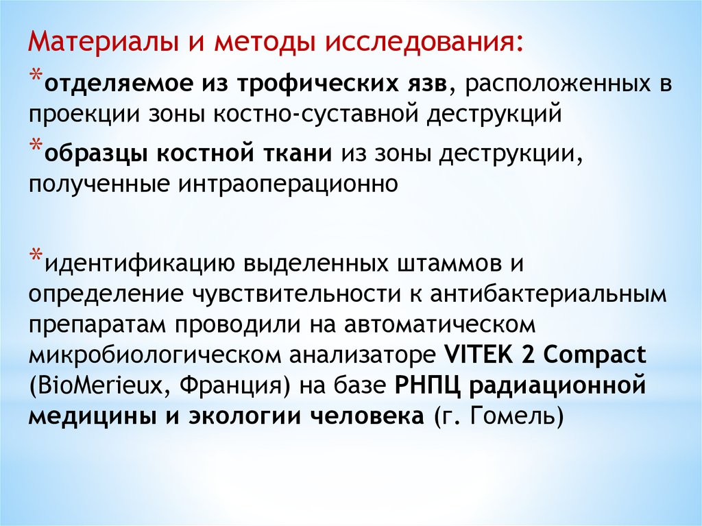 Материалы и методы исследования:*отделяемое из трофических язв, расположенных в