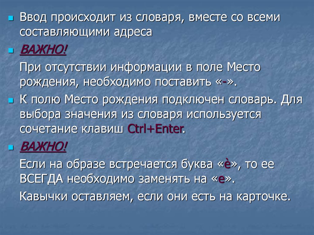 Обратите внимание - чтобы не терять словарные значения и вводитьполноценно адрес, ввод всегда начинайте: