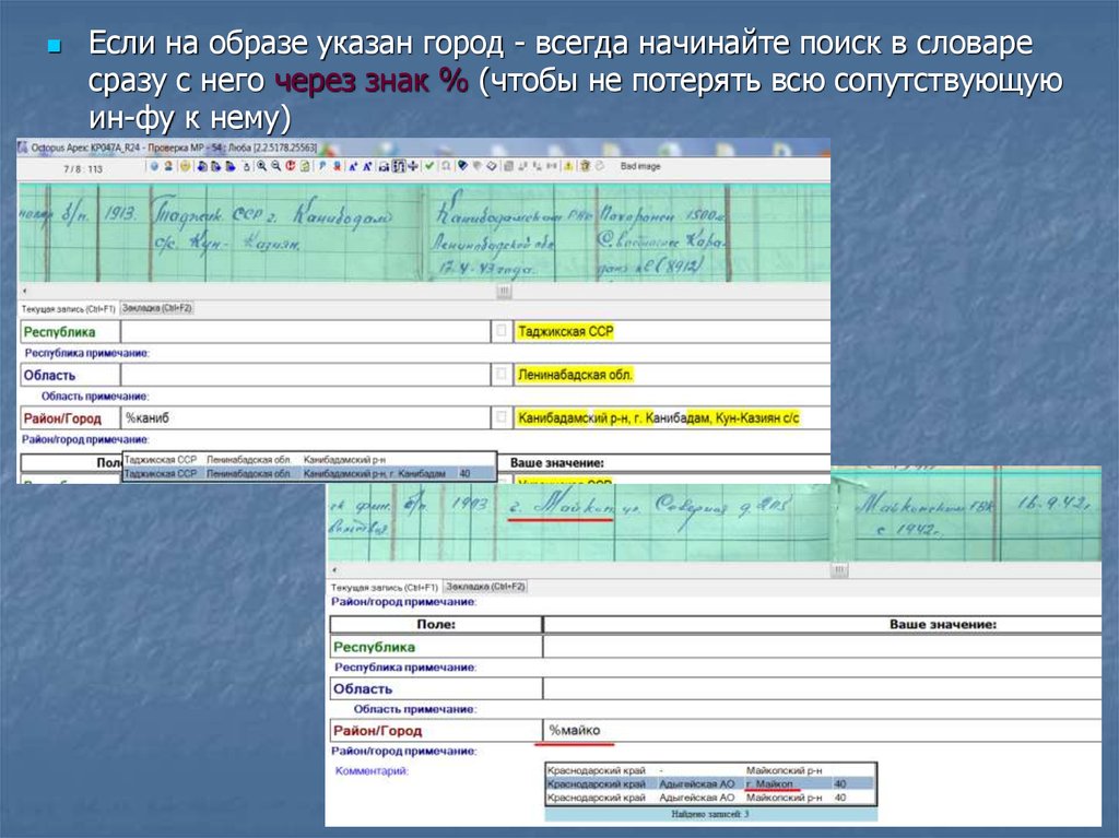 Если на образе указан город - всегда начинайте поиск в словаресразу с него через знак % (чтобы не потерять всю сопутствующую