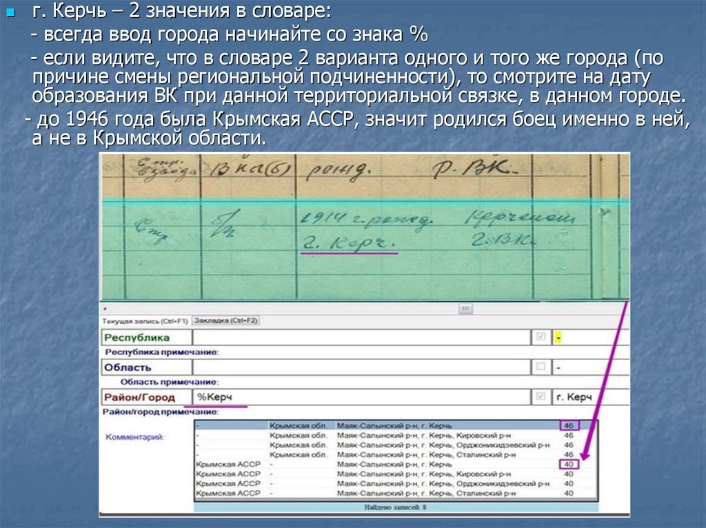 г. Керчь – 2 значения в словаре:- всегда ввод города начинайте со знака %