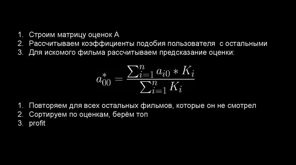 1. Строим матрицу оценок A2. Рассчитываем коэффициенты подобия пользователя с остальными