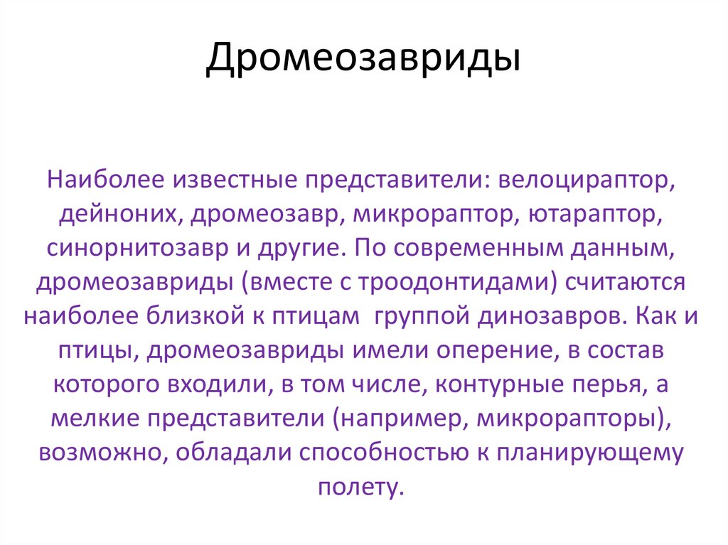 Наиболее известные представители: велоцираптор,дейноних, дромеозавр, микрораптор, ютараптор,