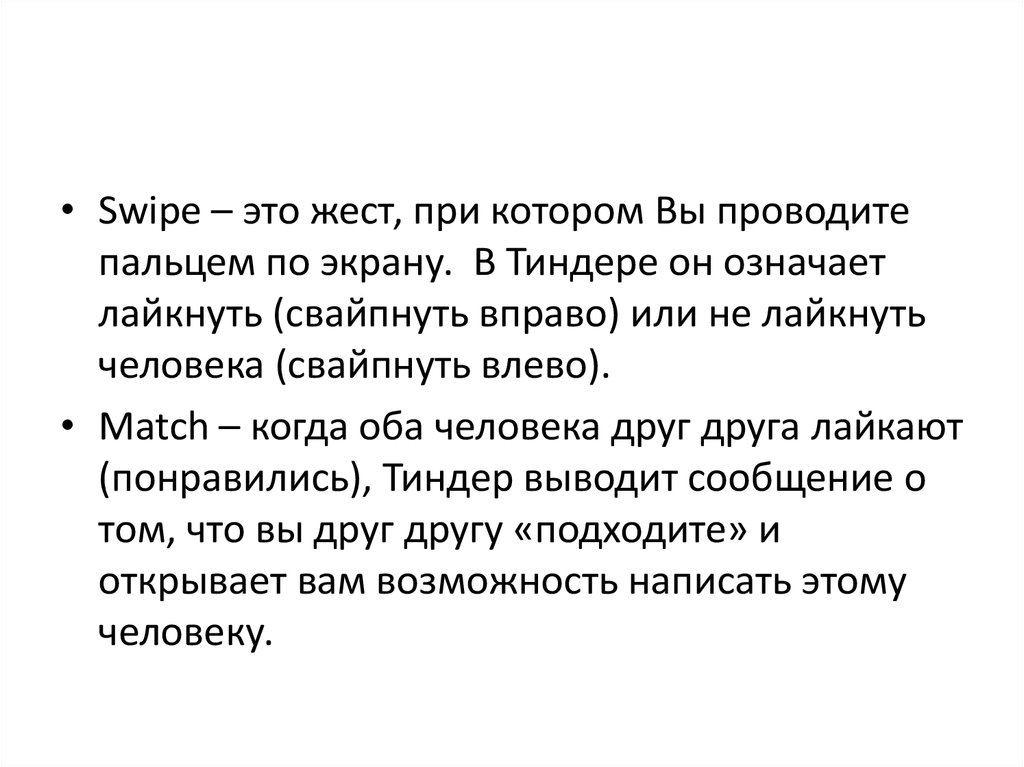 • Swipe – это жест, при котором Вы проводитепальцем по экрану. В Тиндере он означает