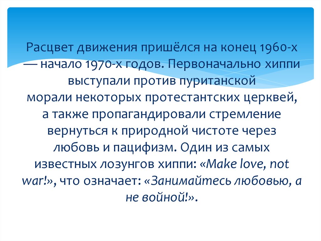Расцвет движения пришёлся на конец 1960-х— начало 1970-х годов. Первоначально хиппи