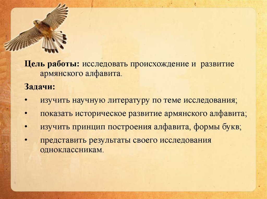 Цель работы: исследовать происхождение и развитиеармянского алфавита.