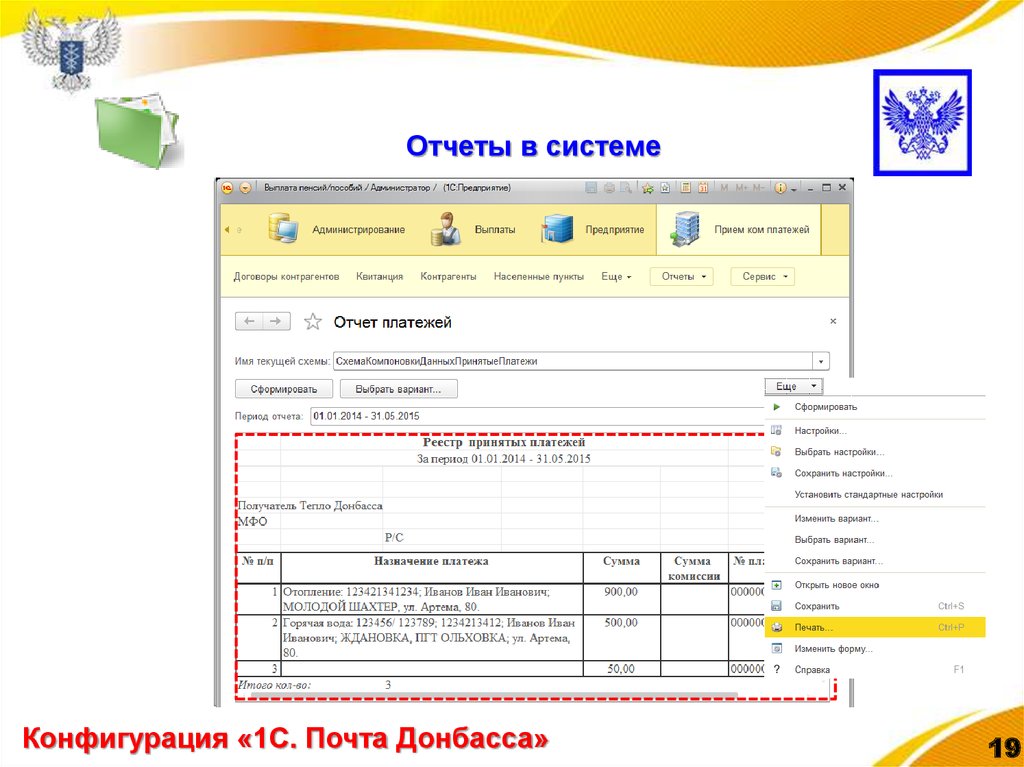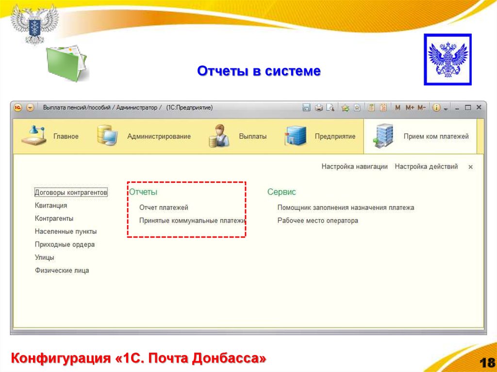 Отчеты в системеКонфигурация «1С. Почта Донбасса»
