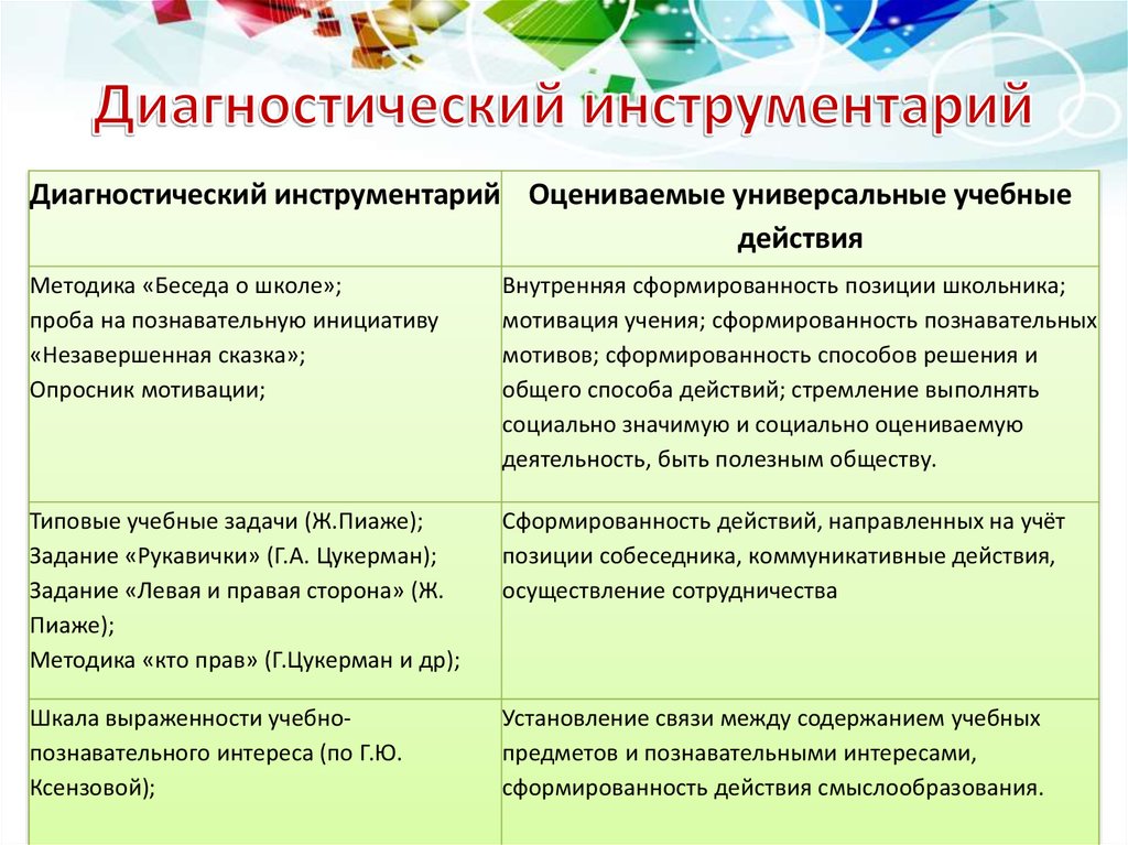 Диагностический инструментарий Оцениваемые универсальные учебныедействия