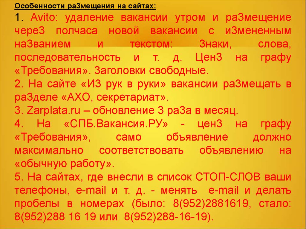 Особенности ра3мещения на сайтах:1. Avito: удаление вакансии утром и ра3мещение