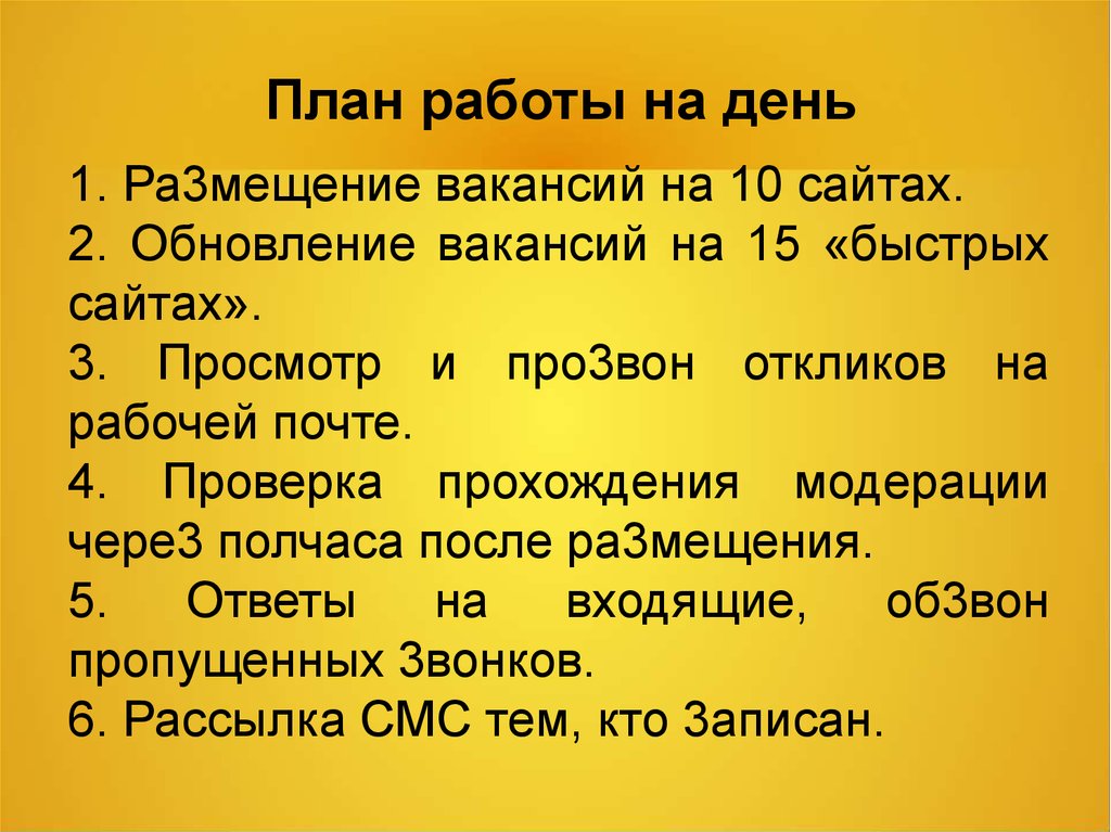 План работы на день1. Ра3мещение вакансий на 10 сайтах.