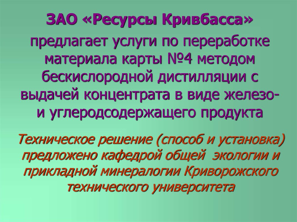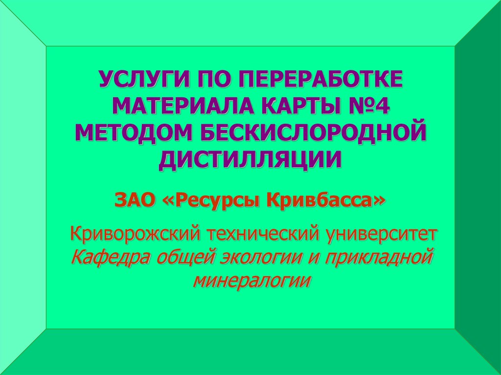 1. УСЛУГИ ПО ПЕРЕРАБОТКЕ МАТЕРИАЛА КАРТЫ №4 МЕТОДОМ БЕСКИСЛОРОДНОЙ ДИСТИЛЛЯЦИИ ЗАО «Ресурсы Кривбасса» Криворожский технический университ