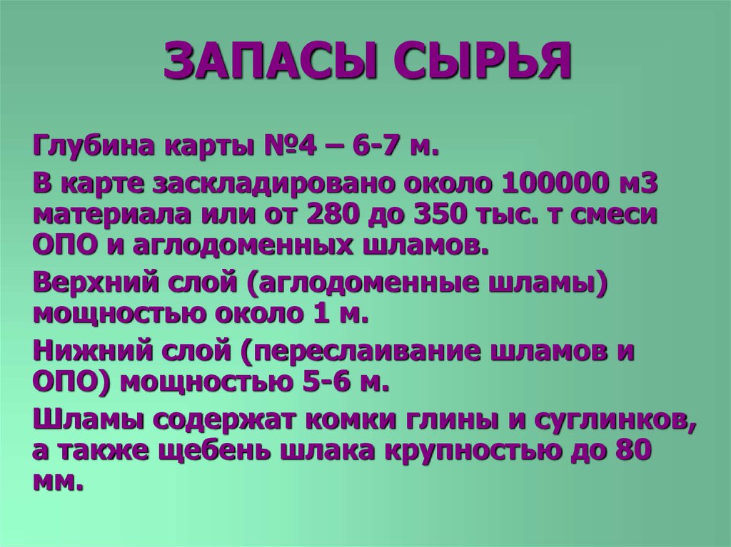 ЗАПАСЫ СЫРЬЯГлубина карты №4 – 6-7 м.