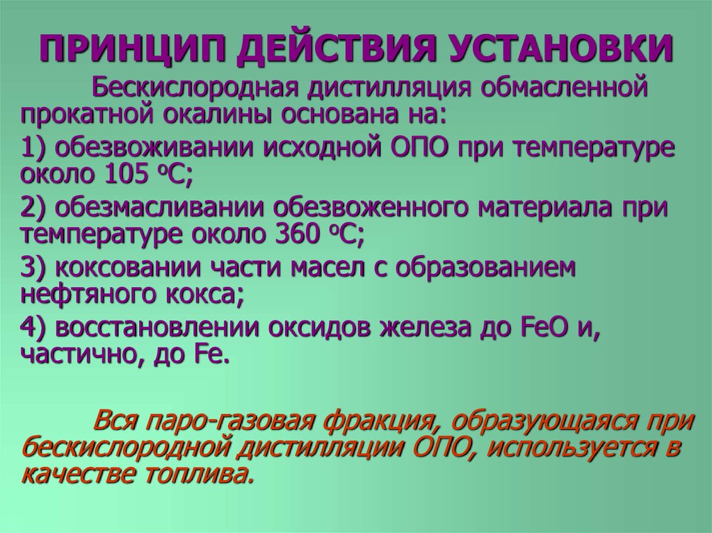 ПРИНЦИП ДЕЙСТВИЯ УСТАНОВКИБескислородная дистилляция обмасленной