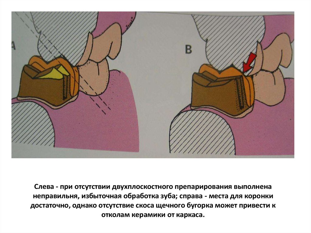 Слева - при отсутствии двухплоскостного препарирования выполненанеправильня, избыточная обработка зуба; справа - места для коронки