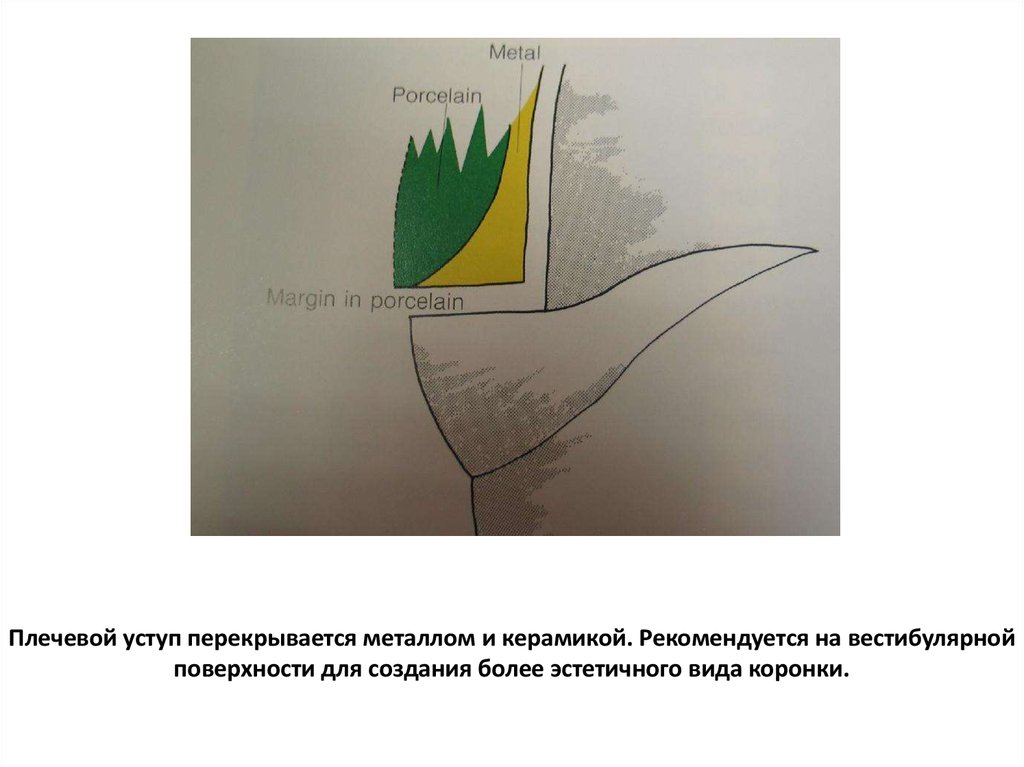 Плечевой уступ перекрывается металлом и керамикой. Рекомендуется на вестибулярнойповерхности для создания более эстетичного вида коронки.