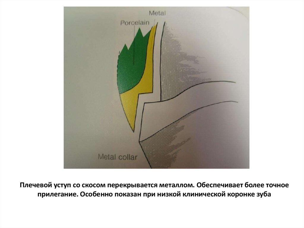 Плечевой уступ со скосом перекрывается металлом. Обеспечивает более точноеприлегание. Особенно показан при низкой клинической коронке зуба