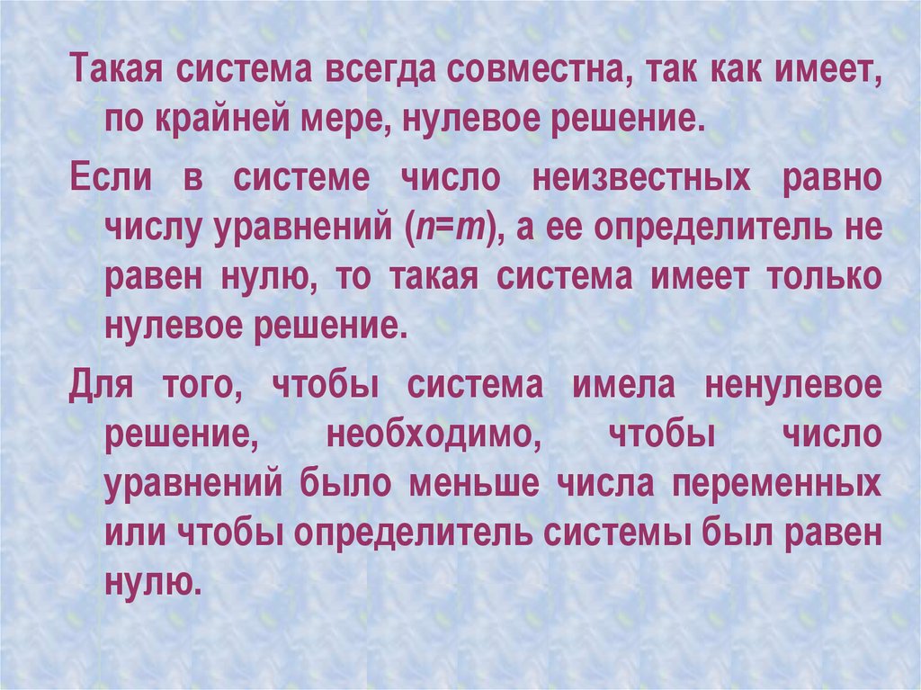 Такая система всегда совместна, так как имеет,по крайней мере, нулевое решение.