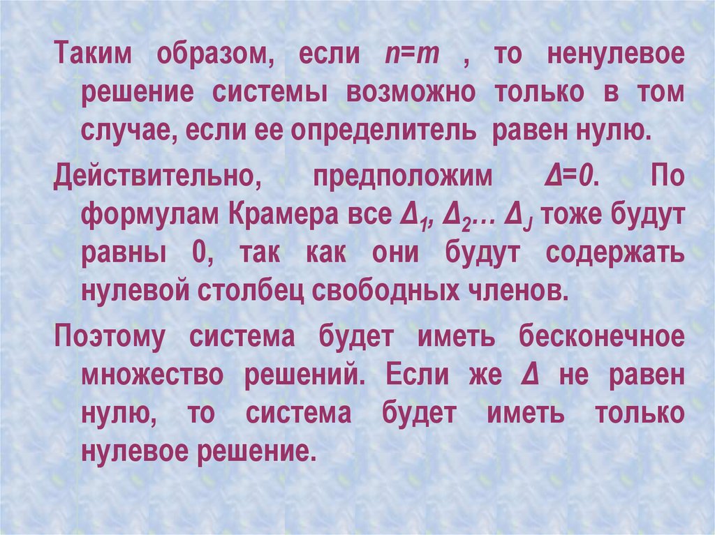 Таким образом, если n=m , то ненулевоерешение системы возможно только в том