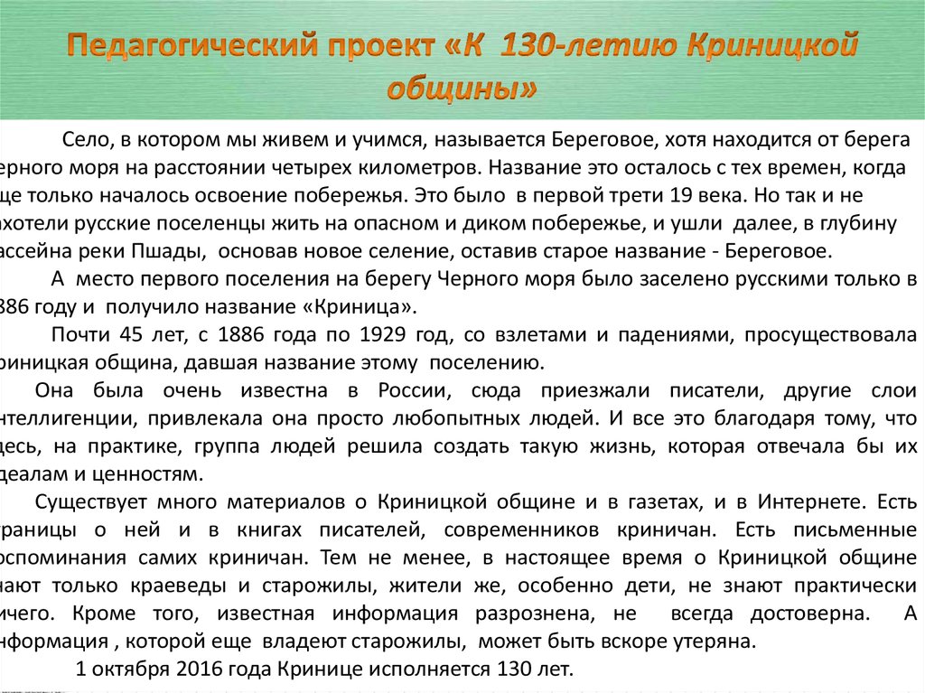 Тема проекта связана с датой основания Криницы. 1 октября