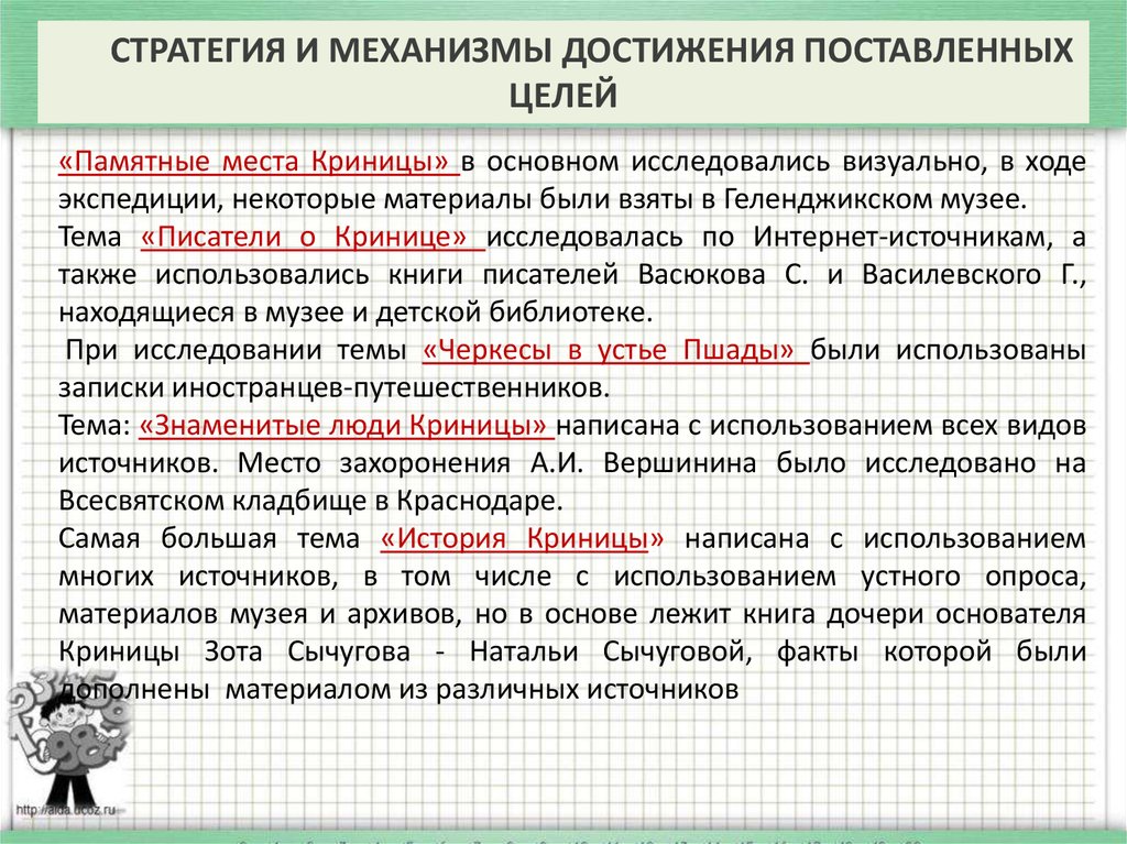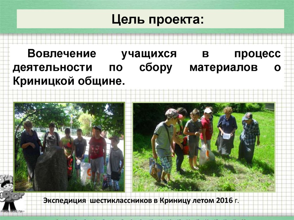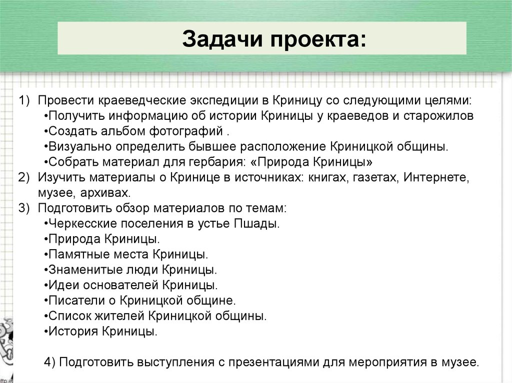 Задачи проекта:1) Провести краеведческие экспедиции в Криницу со следующими целями: