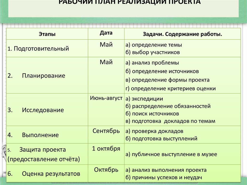 РАБОЧИЙ ПЛАН РЕАЛИЗАЦИИ ПРОЕКТАЭтапы