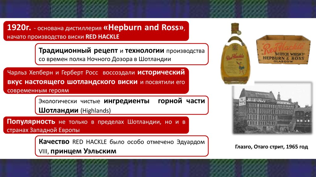 1920г. - основана дистиллерия «Hepburn and Ross»,начато производство виски RED HACKLE