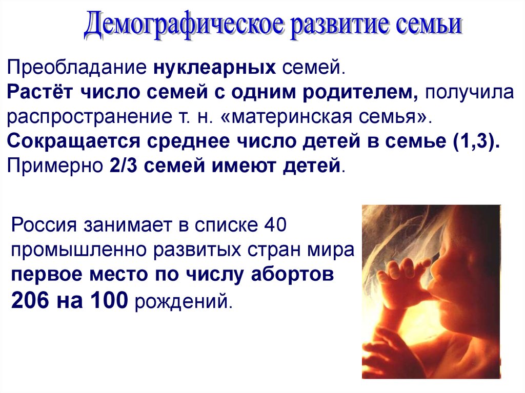 Преобладание нуклеарных семей.Растёт число семей с одним родителем, получила