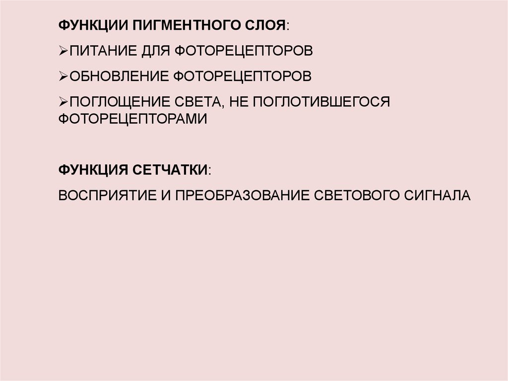 ФУНКЦИИ ПИГМЕНТНОГО СЛОЯ:ПИТАНИЕ ДЛЯ ФОТОРЕЦЕПТОРОВ