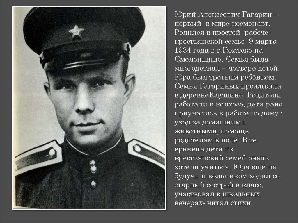 Юрий Алексеевич Гагарин –первый в мире космонавт.