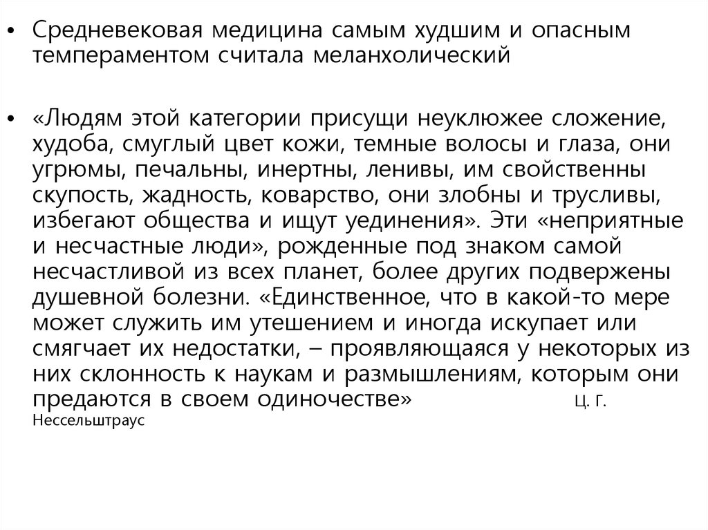 • Средневековая медицина самым худшим и опаснымтемпераментом считала меланхолический