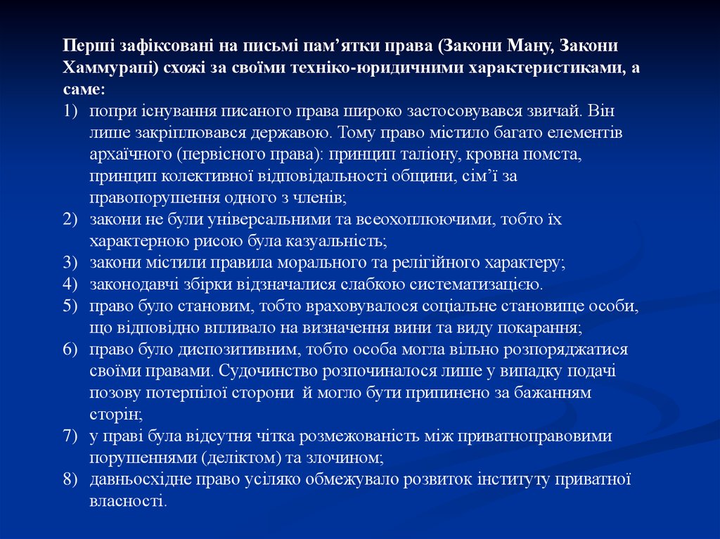 Перші зафіксовані на письмі пам’ятки права (Закони Ману, ЗакониХаммурапі) схожі за своїми техніко-юридичними характеристиками, а