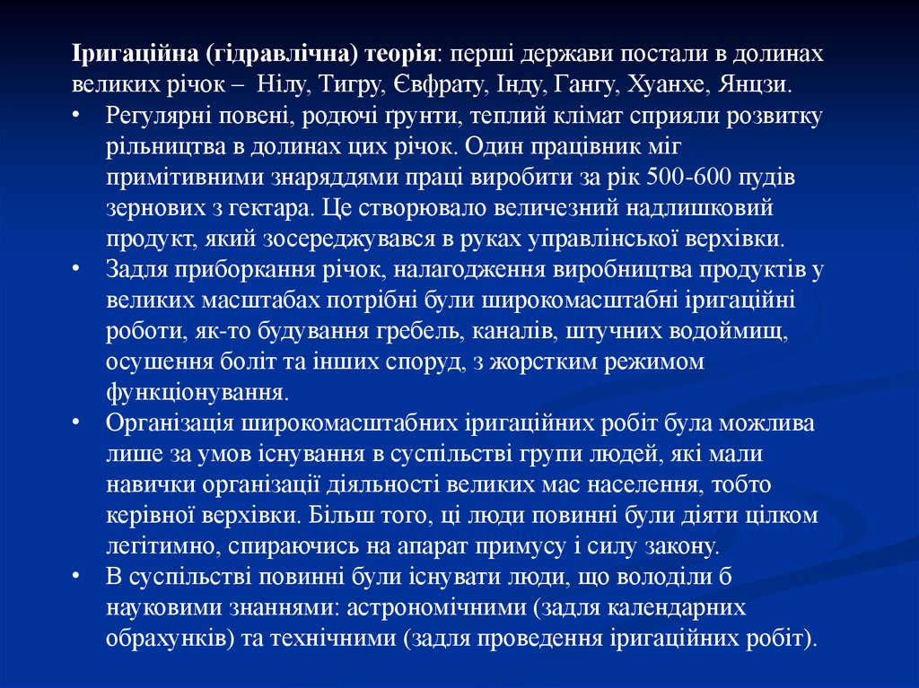 Іригаційна (гідравлічна) теорія: перші держави постали в долинахвеликих річок – Нілу, Тигру, Євфрату, Інду, Гангу, Хуанхе, Янцзи.