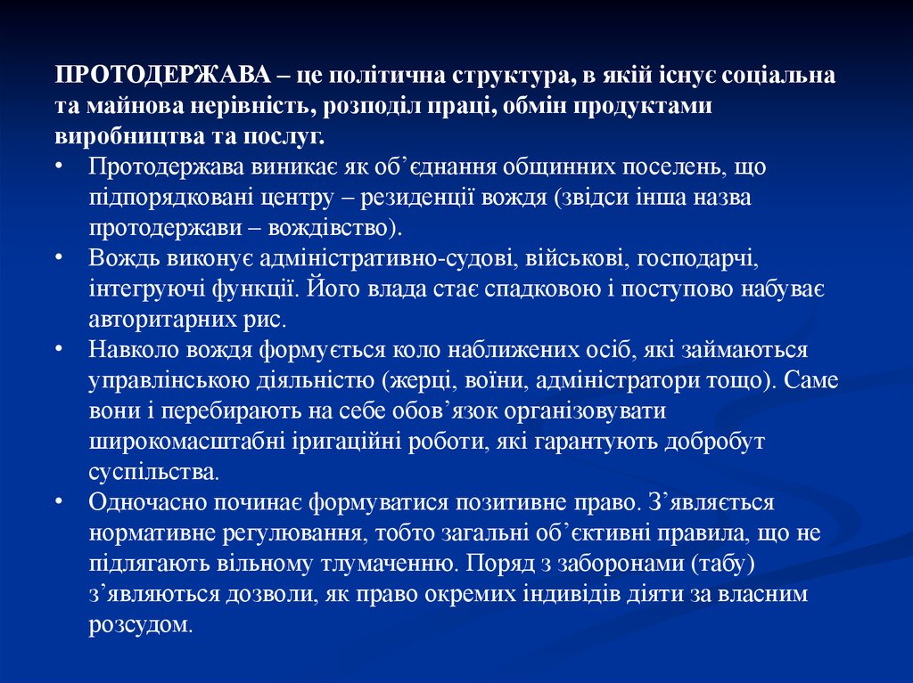 ПРОТОДЕРЖАВА – це політична структура, в якій існує соціальната майнова нерівність, розподіл праці, обмін продуктами