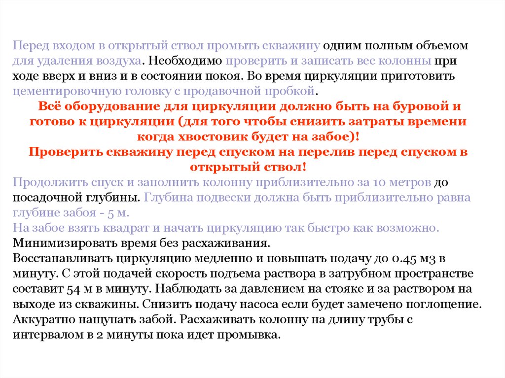Перед входом в открытый ствол промыть скважину одним полным объемомдля удаления воздуха. Необходимо проверить и записать вес колонны при