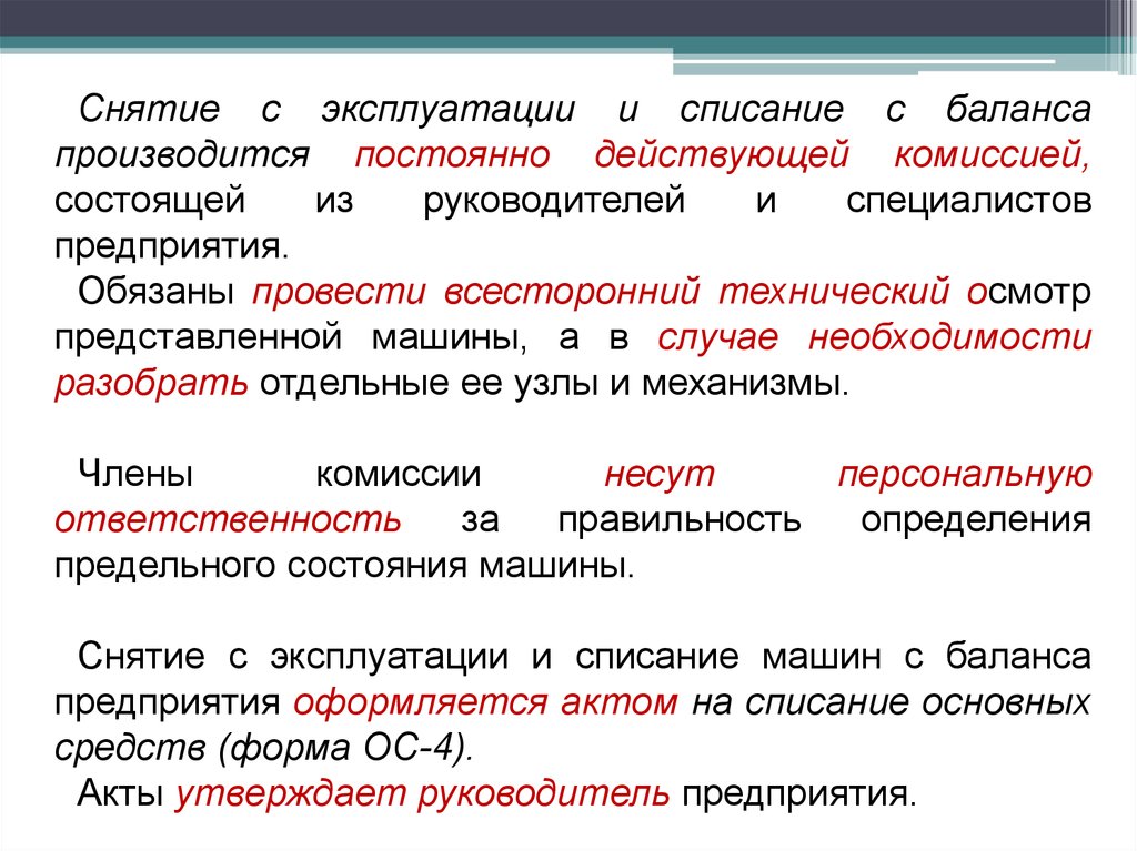 Снятие с эксплуатации и списание с балансапроизводится постоянно действующей комиссией,
