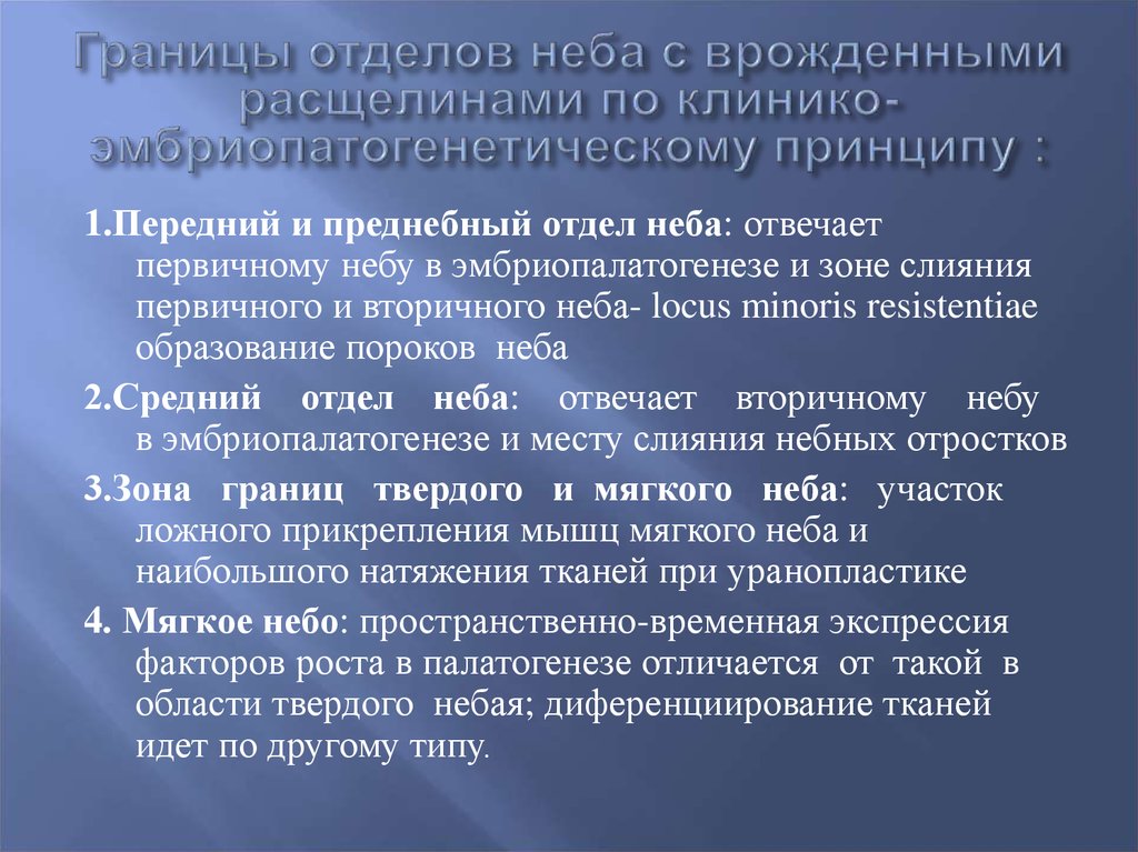 1.Передний и преднебный отдел неба: отвечаетпервичному небу в эмбриопалатогенезе и зоне слияния