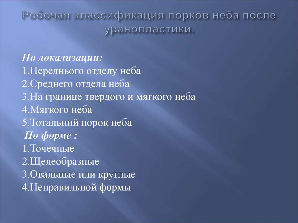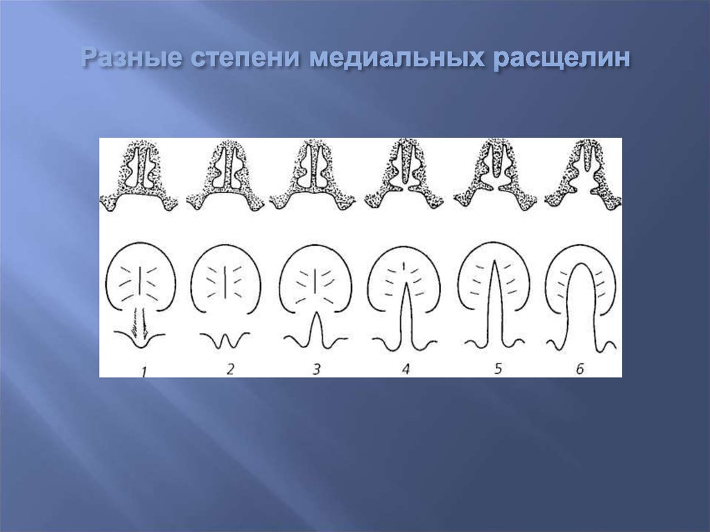 I.Расщелина губы: двусторонняя, серединная, односторонняя.II.Расщелина неба.