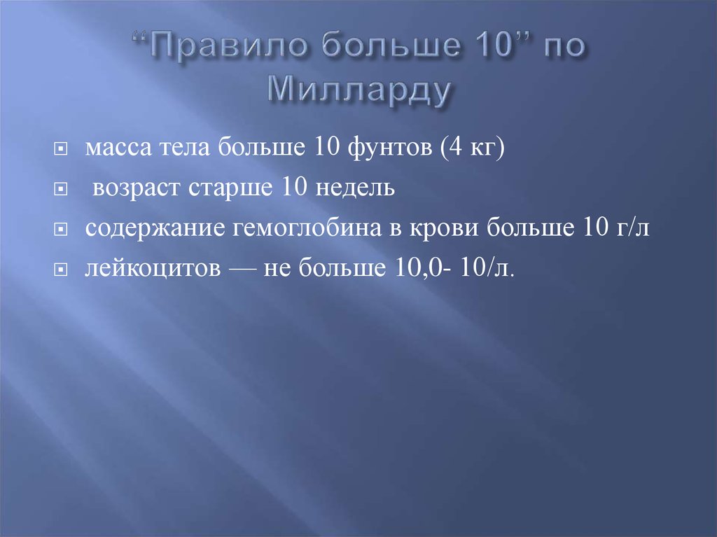 масса тела больше 10 фунтов (4 кг)возраст старше 10 недель