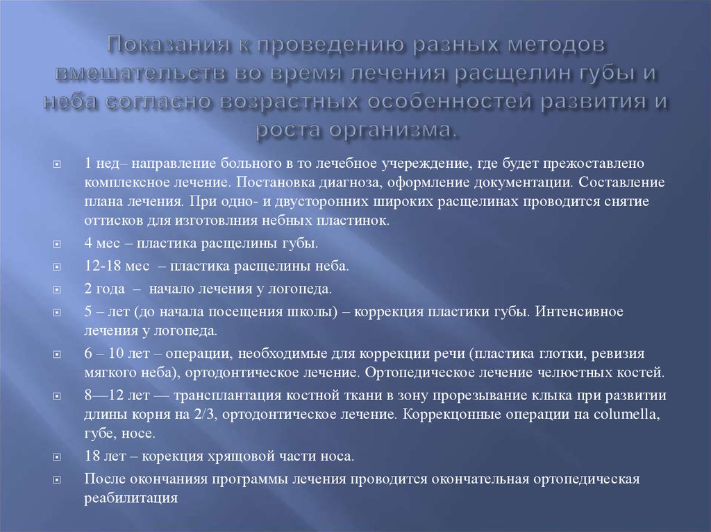 мягкого неба), ортодонтическое лечение. Ортопедическое лечение челюстных костей.