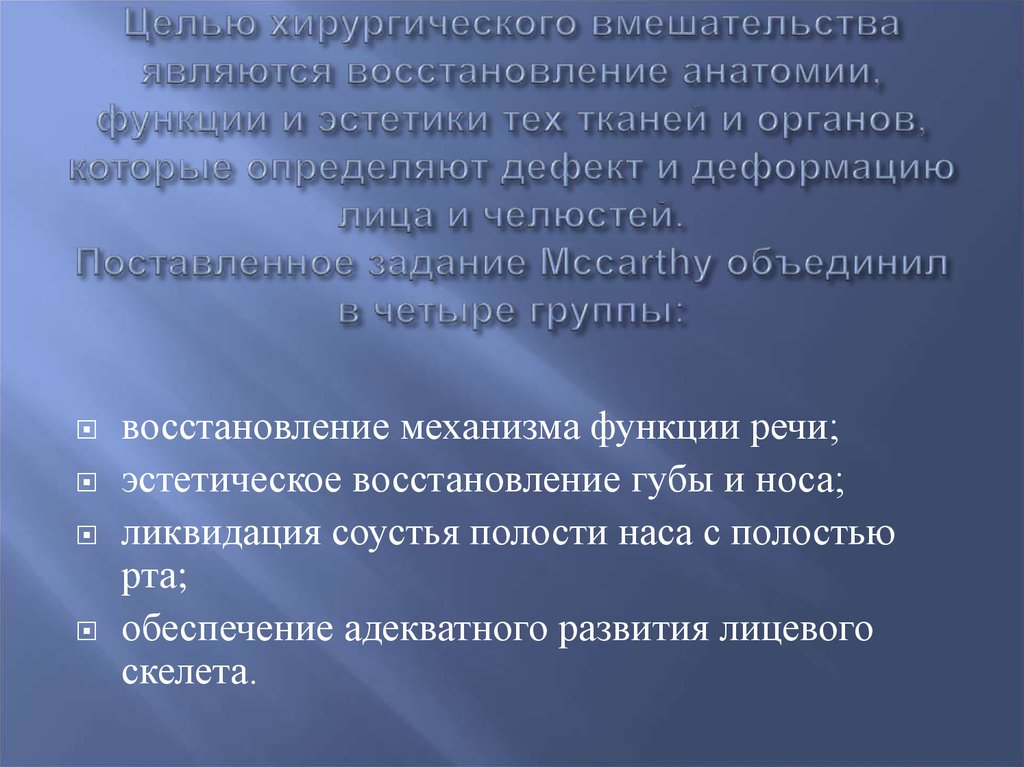 восстановление механизма функции речи;эстетическое восстановление губы и носа;