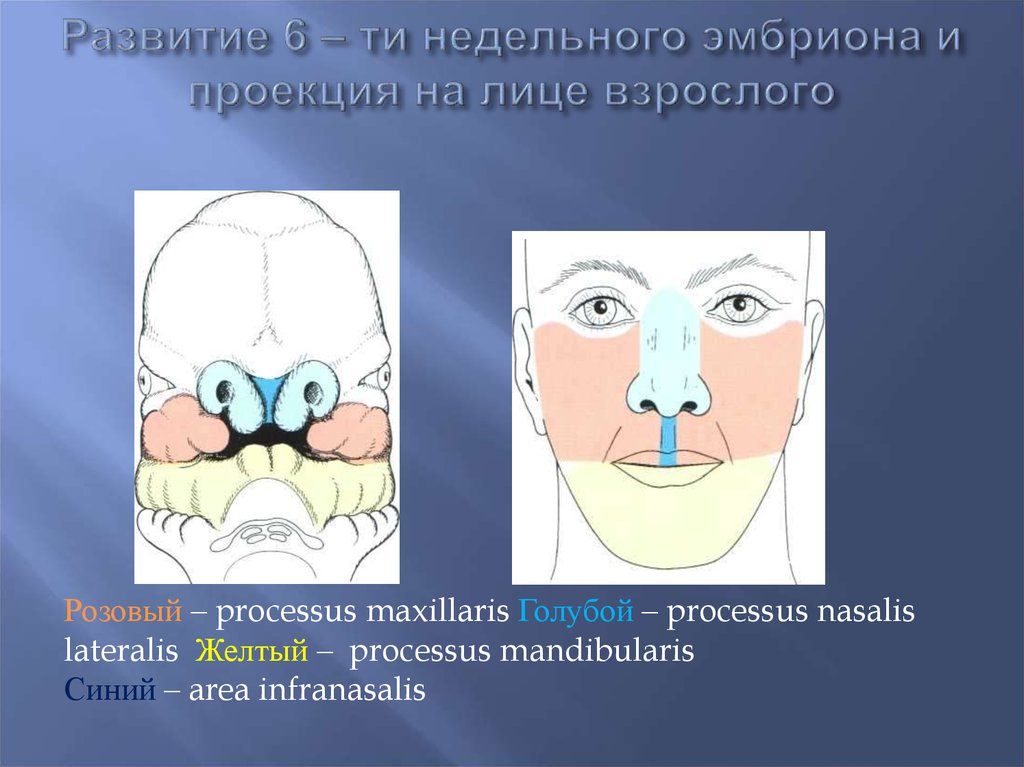Розовый – processus maxillaris Голубой – processus nasalislateralis Желтый – processus mandibularis
