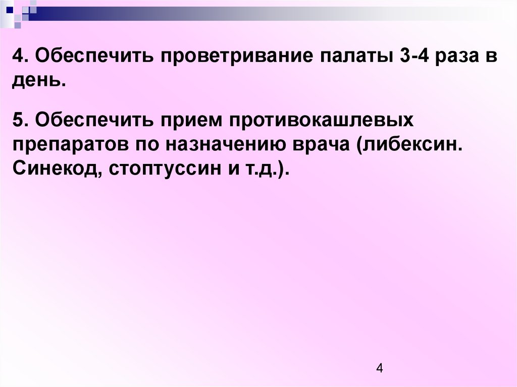 4. Обеспечить проветривание палаты 3-4 раза вдень.